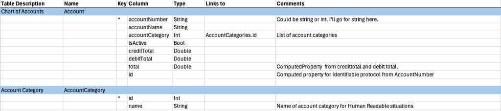 I’m using a simple spreadsheet method. You’ll notice in both schemas that I linked the account category to another file: AccountCategory. Instead of adding the account category directly to the account, I placed it in a separate file, making it much easier to expand the possible categories.