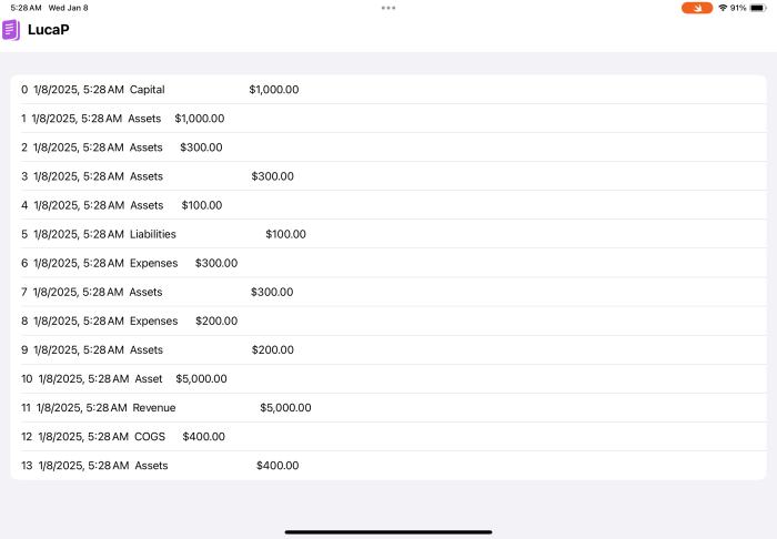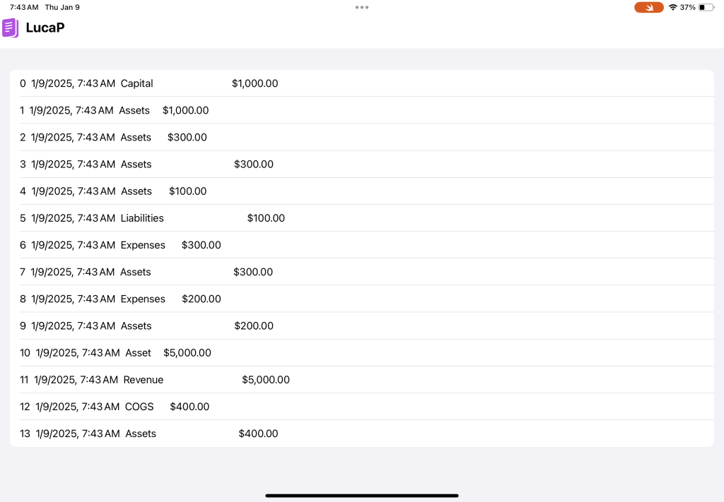 We want the ledger to tell the story of how we moved our money around. Our transaction list from last time